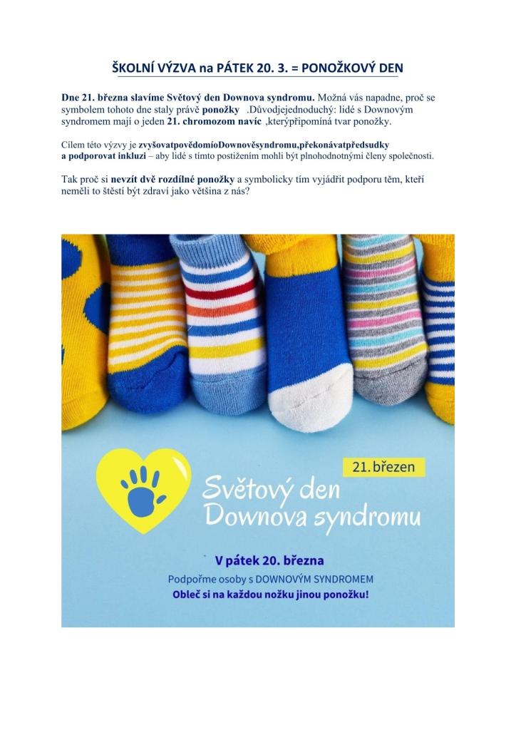 Dne 21. března slavíme Světový den Downova syndromu. Možná vás napadne, proč se symbolem tohoto dne staly právě ponožky. Důvod je jednoduchý: lidé s Downovým syndromem mají o jeden 21. chromozom navíc, který připomíná tvar ponožky.