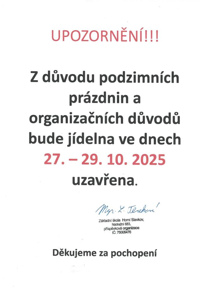Upozornění – uzavření školní jídelny Z důvodu podzimních prázdnin a organizačních důvodů bude školní jídelna uzavřena ve dnech 27.–29. října 2025. Děkujeme za pochopení. ZŠ Horní Slavkov